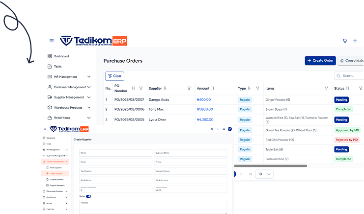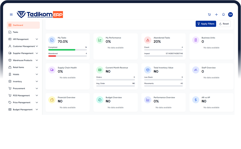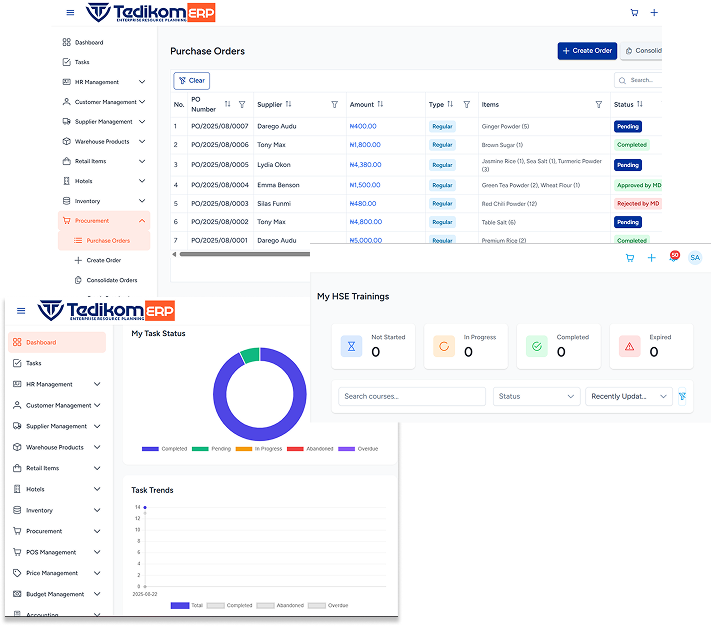 Tedikom ERP is a modern, modular enterprise resource planning system built to help businesses of all sizes manage everything from inventory to HR, finance, sales and more — all from a single, intuitive dashboard